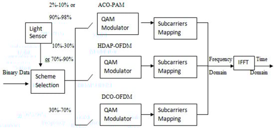 The study in [28] introduces pre-distorted enhanced ADO (PEADO-OFDM), where the receiver is designed in such a way that takes care of the latency and the complexity issues. In HACO [19], a combination of ACO and PAM-DMT is used. In this system, ACO and PAM-DMT are transmitted together by sending ACO in odd subcarriers and PAM-DMT even in imaginary subcarriers. No DC bias is needed in this scheme. The clipping noise is calculated at the receiver and eliminated to retrieve PAM-DMT symbols. The advantage of this scheme is the increased data rate. Moreover, no additional DC bias is used, and the spectral efficiency is improved. There is a slight degradation in signal-to-noise ratio (SNR), but there is an improvement in the peak to average power ratio (PAPR). The efficiency of the HACO system is improved in [29], where PAPR is reduced compared to ACO. This system results in a low BER of 10−7. AHO is a combination of ACO and PAM-DMT [21]. In AHO, the ACO signal is added to the inverted PAM-DMT signal. This scheme provides a wide dimming range with better spectral efficiency than HACO [21]. In HDAP, DCO symbols are placed in the lower subcarriers, while ACO and PAM-DMT symbols are placed in the higher odd and higher even subcarriers, respectively. This HDAP scheme is optically power efficient with a low PAPR and provides a wide dimming range.