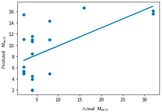 Predicted versus actual MDCO of dc-biased pulse amplitude modulated orthogonal frequency division multiplexing (DPO-OFDM) for the case of linear regression. Note that MDCO stands for the constellation size of DC-biased optical OFDM (DCO-OFDM).