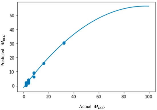 Predicted versus actual MDCO of dc-biased pulse amplitude modulated orthogonal frequency division multiplexing (DPO-OFDM) for the case of polynomial regression of degree = 4. Note that MDCO stands for the constellation size of DC-biased optical OFDM (DCO-OFDM).