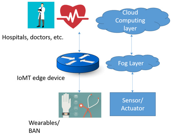 Traditionally, at the onset of the cloud computing era, data collected from IoMT devices are processed by cloud servers using computationally intensive tasks like machine learning algorithms and big data analytics [25]. However cloud-based computing is an energy-inefficient solution, incurs extra latency and puts user privacy at risk. To circumvent these shortcomings, fog-based computing has been advocated (Figure 3). Edge devices in the fog computing paradigm can process, store, and transmit data.