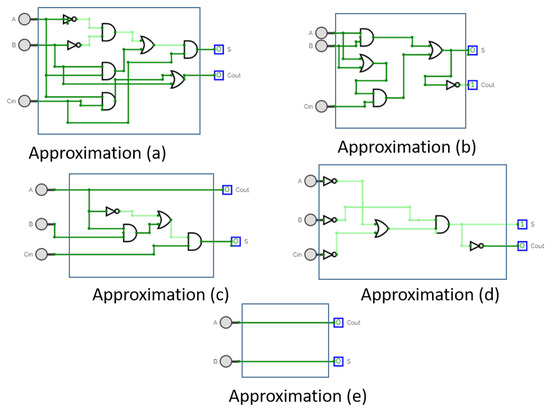 Approximate computing can be done at various abstraction levels: data, circuit, architectural, instruction, algorithm, and system level. An approximate circuit is achieved by reducing the number of partial products in designing multipliers [34] and the number of transistors in designing the mirror adder [35]. A comprehensive survey on the approximate arithmetic circuit is reported in [36]. In the biomedical domain, the work of [37] devised an approximate adder circuit by reducing the number of gates from five gates (two AND, two XOR, and one OR) to four gates (two OR, one AND, and one XOR gates). The approximate adder was then used to design an energy-efficient Baugh–Wooley multiplier. In [38], the authors used approximate adders and multipliers to design an energy-efficient wearable that implements the Pan–Tompkins algorithm for the detection of the QRS complex. The algorithm has five stages. First, the ECG signal is recorded and sampled using an ADC converter. Afterwards, the sampled signal is filtered using a low-pass filter followed by a high-pass filter. The output is then squared and integrated. The algorithm is computation-intensive in which the optimization of the bit-width and the architecture of the arithmetic circuits play an inevitable role in reducing the overall power consumption. To accomplish this, the authors used five types of approximated full adders (Figure 5) and two architectures of the approximate multiplier. The approximation starts from the LSB and moves towards the MSB. In each iteration, both energy saving and accuracy of peak detection are determined. The process halts when the maximum number of LSBs has been approximated without affecting the structure similarity index measure (SSIM).
