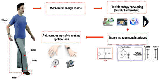- Liu, Y.; Khanbareh, H.; Halim, M.A.; Feeney, A.; Zhang, X.; Heidari, H.; Ghannam, R. Piezoelectric energy harvesting for self-powered wearable upper limb applications. Nano Select 2021, 2, 1459–1479. [Google Scholar] [CrossRef]
