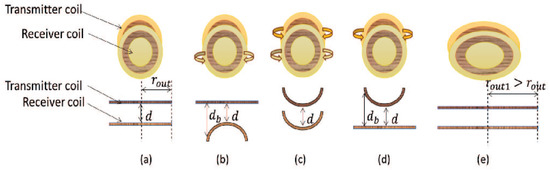 Flexible coil misalignment (a) ideal, (b) bended transmitter coil, (c) bending of both coils, (d) bended receiver coil, and (e) coil stretching.