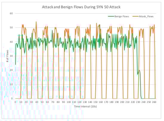 The impact of a pulse-shaped SYN flooding attack with an average rate of 2.5 rps (and peak rate of 50 rps) on benign traffic. The x-axis is marked by 10-s intervals, and the y-axis represents number of new benign and attack flows in each interval.
