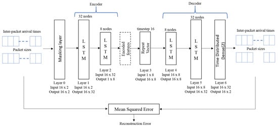 Figure 3 gives the block diagram of the LSTM Autoencoder model we developed. The input data is a 2D array with 16 timesteps (each packet arrival is a timestep) and the two features–interarrival times of packets within a flow and packet sizes. In our experiments, 16 timesteps were sufficient to include the first two seconds of a traffic flow. However, due to unequal packet arrival rates of different flows, the input data samples may have unequal sequence lengths. We address this issue by padding the end of a sequence with dummy values (−1) so that each data sample consists of 16 timesteps. Each layer of the LSTM Autoencoder is described below: