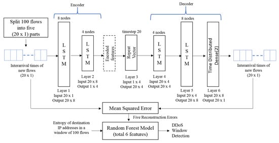 The flow detection methods focus on the detection of DDoS attack flows by extracting suitable features of individual traffic flows [45]. However, they often have high network data processing overhead and require tracking packets by flows. We present an LSTM Autoencoder model for DDoS flow detection. It uses only two features, extracted with low processing overhead, to model the dynamic behavior of benign TCP flows and distinguish them from DDoS flows. An LSTM Autoencoder [48] is a type of self-supervised deep learning model that can learn a compressed representation (encoding) of a sequence data and reconstruct (decoding) from the reduced encoding a representation as close as possible to its original input. It uses an encoder–decoder architecture consisting of multiple LSTM layers.