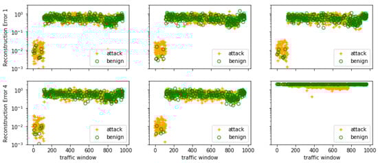 Figure 5 shows the five reconstruction errors corresponding to five subsequences from the LSTM Autoencoder in Stage 1 and the entropies of windows used for training the RF model in Stage 2 for . We observe that using only a subset of these features will not be sufficient to accurately detect a window with attacks since there are significant overlaps between the input feature values for multiple attack and benign windows. Therefore, a machine learning model that combines all of these features is used to make predictions. The training dataset used in Stage 2 included roughly 70% of all benign and attack traffic.