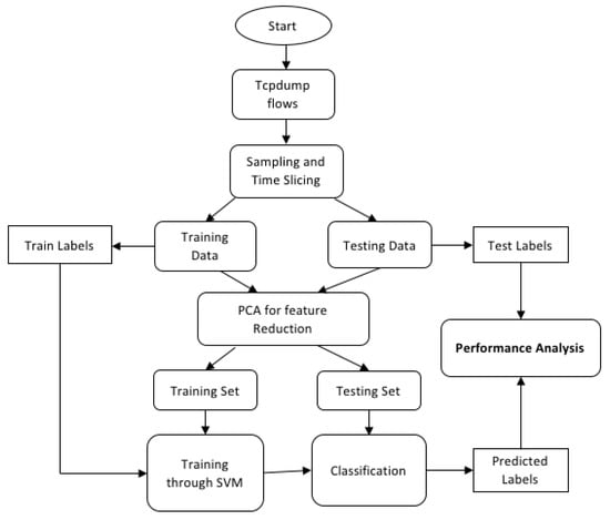 Therefore, to evaluate its effectiveness for the transaction type TCP traffic in which the TCP connections involve downloading web objects by clients and are short-lived, we adapted the PCA-SVM model for low-rate DDoS attack detection. A block diagram of the adapted model is shown in Figure 6. The main steps in the model are described below.