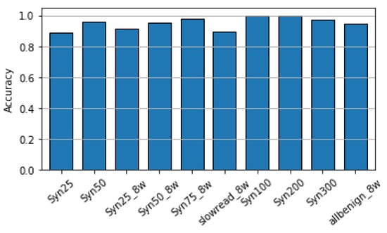 The RF model in Stage 2 is fed with the reconstruction errors of windows from LSTM in Stage 1 and the Shannon entropies of windows. If Stage 1 is omitted, then, with the Shannon entropy as the lone feature, RF model performs worse, with accuracy dropping to 90% or below for both traffic cases. To use an LSTM model by itself for window detection, we need to provide more data than the interarrival times of new flows. Determining whether a flow is an attack flow based on its interarrival time only is similar to predicting success in a Bernoulli trial. Figure 8 gives the accuracy of the LSTM-RF hybrid model for each traffic type present in the testing dataset.