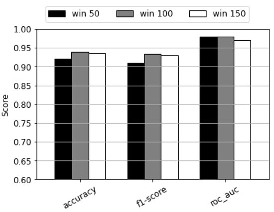 Figure 9 shows the accuracy, F1-score, and ROC AUC score of the LSTM-RF hybrid model for window sizes 50, 100 and 150. The window size of 100 flows provides the best results for all three metrics.