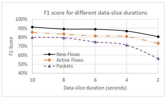 The data-slice duration determines the time required to form a data slice for detection; ten seconds could be too long to wait during a DDoS attack. Therefore, we analyzed the performance of the PCA-SVM model with 2, 4, 6, and 8 s as data-slice durations for the all traffic case. Our analysis shows that the performance decreases with shorter data-slice durations. Figure 10 presents F1-scores for various data-slice durations with the number of new flows, active flows, and packets per sample as TCP flow values.