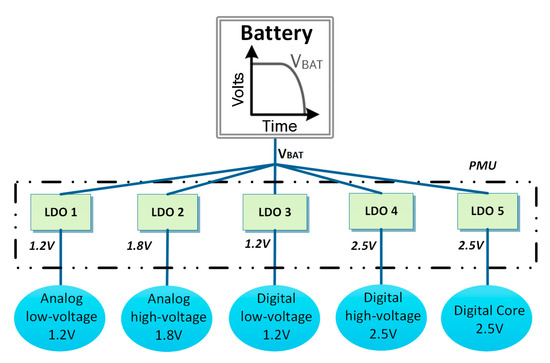 The increasing appearance of long-life autonomous portable and wearable equipment [1,2,3,4,5,6,7,8] demanding miniaturized systems with decreasing power consumption has brought to the forefront the design of efficient power management units (PMU), where low dropout (LDO) regulators play a key role [9,10,11,12,13]. As shown in Figure 1, in battery-operated systems, the LDO generates, from the battery voltage VBAT, a stable, low-noise and accurate supply voltage Vout under substantial changes of the battery voltage and the load current demanded to bias a specific system module, typically making use of multiple LDOs so as to optimize each module power consumption and, therefore, the global power efficiency.