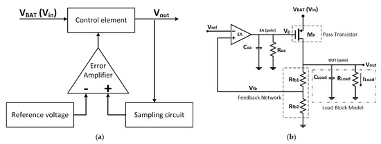 Figure 2a illustrates the basic scheme of a linear regulator, which provides a regulated voltage Vout from an unregulated input voltage Vin, which is the battery voltage VBAT for the power management unit of a battery-operated portable device [29]. A sampling circuit is responsible for sensing the variations over Vout because of variations in the power supply and/or in the load current. An error amplifier (EA) compares the difference between this signal and a reference voltage, Vref, and drives the control element, which makes the necessary modifications to set the desired voltage at the output.