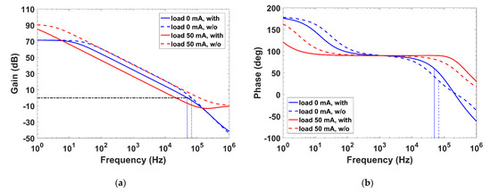 (a) Gain and (b) phase margin with (straight line) and w/o (dotted line) compensation for maximum ILoad (50 mA, red) and minimum ILoad (0 mA, blue).