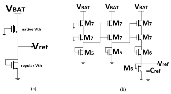 For the topology in Figure 8a, setting the current equal through the native and the regular transistor, the reference voltage is given by [39]: