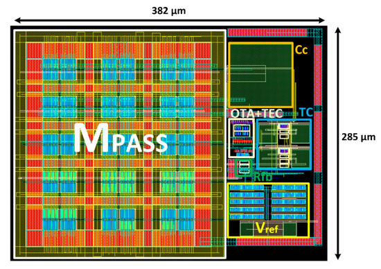 The proposed LDO design has been implemented in the 180 nm CMOS technology from UMC. The layout view is shown in Figure 9 with a total area consumption of 382 µm × 285 µm. The reported postlayout simulation results have been executed using Spectre with a BSIM3v3 level 53 transistor model. A 0.5 μA bias current is inserted to the circuit through a 1:2 current mirror, displaying a total Iq in steady state of 5.5 μA if the TC transient circuit is used and of 8.6 μA if the TEC transient circuit is added—including the generation of the bias voltages VBN and VBP-. It presents a temperature-independent voltage supply-independent Vout = 1.2 V, for a battery-supplied Vin ranging from 3.3 V down to ~1.3 V, with a Vdo ~ 100 mV and a maximum load of 50 mA and 50 pF.