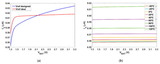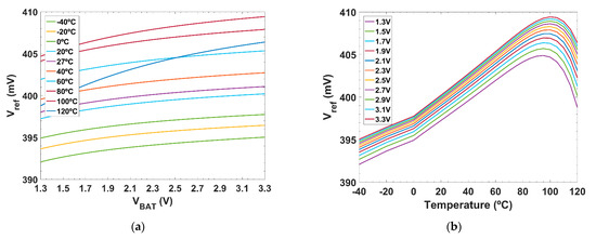 Figure 10a shows the temperature and Figure 10b the battery voltage, VBAT, dependence of the reference voltage, Vref, which remains almost constant at 400 mV. For a temperature variation from −40 to 120 °C the maximum Vref variation is 87.5 ppm/°C (at VBAT = 2.5 V), and for a power supply variation from 1.3 to 3.3 V, the Vref variation is 0.0155%/V (at 27 °C).