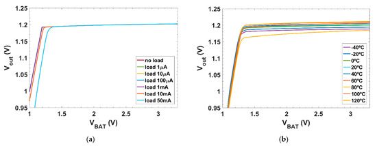 Figure 11 shows the static VBAT − Vout characteristic. Figure 11a presents the results for a voltage sweep from 3.3 V down to 1.0 V, at room temperature, Troom, for different ILoad from 0 to 50 mA. The LDO regulator provides a constant Vout of 1.2 V for VBAT > 1.31 V (dropout voltage, Vdo of 110 mV) with an error < 1 % for all range of load currents. Figure 11b present the same characteristic against temperature (from −40 to 120 °C) for the designed Vref with maximum load current, showing a maximum variation of 26.8 mV (168 ppm/°C) in Figure 11b.