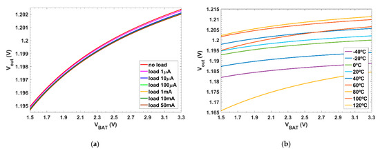 Load regulation for different: (a) battery voltages and (b) temperatures (with VBAT = 2.5 V).