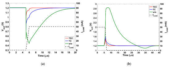 Figure 15 presents the performance for a full load transition (0 mA—50 mA—0 mA with 1 µs rise/fall times) for VBAT = 3.3 V, with and without the TC and TEC transient circuits. Figure 15a presents the undershoot (US) performance and Figure 15b the overshoot (OS) performance.