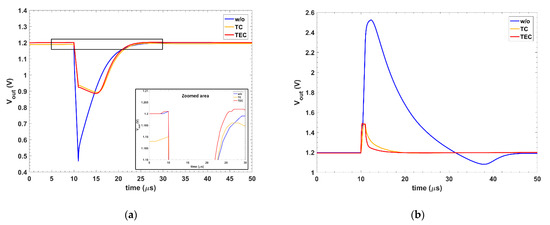 Load transient behavior: with and w/o the TC and TEC transient circuits for VBAT 3.3 V: (a) undershoot and (b) overshoot.