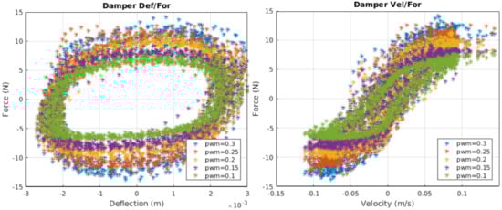 - Electro-Rheological damper (ER damper): it is similar to an MR dampers. It is filled by an ER fluid, which is a mixture of oil and micron sized particles sensitive to electric field. Therefore, as the electric field changes, the volume of the ER fluid changes and thus the damping coefficient of these dampers changes. This is controlled by adjusting the electric field [,]. This kind of damper is used in the INOVE test-bench developed in Gipsa-Lab (Grenoble, France) together with Soben [] for the vehicle vertical dynamics study and analysis. As illustration, the SER diagram of the Electro-Rheological semi-active damper of the INOVE Car is given in Figure 2 from real data: on the left the Force-Deflection diagram and on the right the Force-Velocity one. As seen, the characteristics do depend on the control level given by the electrical field (in practice this is a PWM signal to control the voltage).