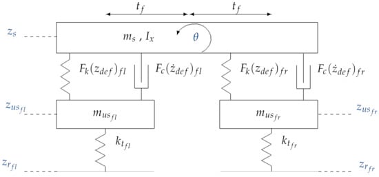 In the studies dedicated to suspension systems, the model must catch the dynamical behavior of the car. Such a model can be obtained through physical equations as described in dedicated books (see [,]), or using dedicated softwares as Simcenter Amesim (Siemens), CarSim (Mechanical Simulation Corporation), Dymola (Dassault Systems) …).