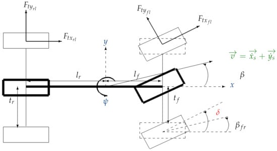 where and are the (global) lateral tire forces of the front and the rear wheels (axle), respectively. denotes the side slip angle at the vehicle center of gravity. This model is highly nonlinear since it involves nonlinear lateral tire forces (that may be represented usin Pacejka or Dugoff tire models) and depends on the longitudinal vehicle velocity v.