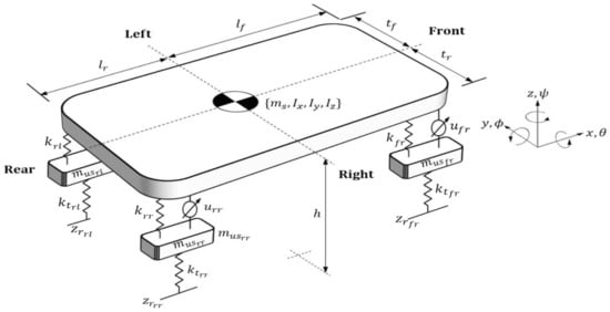 The full car 7 degree-of-freedom (DOF) vertical model (see Figure 6) is used to represent the complete vehicle vertical dynamics. It involves the chassis dynamics (vertical (), roll () and pitch() at the center of gravity), and the vertical displacements of the wheels at the front/rear ()-left/right corner (). The vertical 7 DOF full-car model is governed by the following dynamic equations: