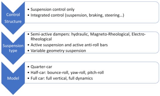 The studies dedicated to suspension control can be organized according to the chart presented in Figure 7, where are emphasized the control structure layer, then the type of suspension which have been considered, and finally the models which are used to compute the control solution.