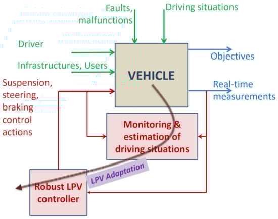 - Fergani, S.; Sename, O.; Dugard, L. Performances improvement through an LPV/H∞ control coordination strategy involving braking, semi-active suspension and steering Systems. In Proceedings of the 2012 IEEE 51st IEEE Conference on Decision and Control (CDC), Maui, HI, USA, 10–13 December 2012; pp. 4384–4389. [Google Scholar] [CrossRef]