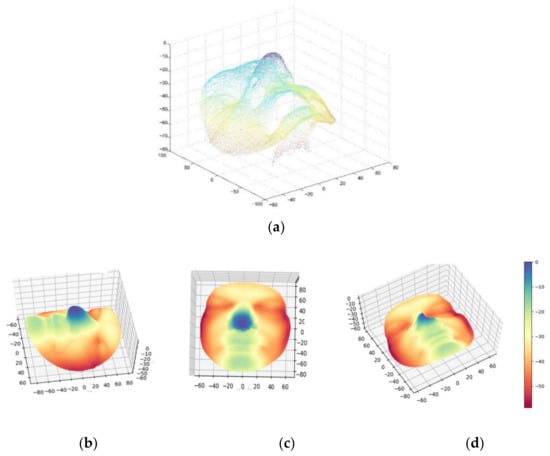 The pre-processed results of a 3D point cloud image, where (a) is the face scanned from the devices, and (b–d) are the 3D face after removing outliers, interpolation operation, and smoothing from three angles. The values of the Z-axis in an image represent the distance between each point of the face and the tip of the nose, where red-colored dots are farther from the tip of the nose, and dots become more blue as the distance to the tip of the nose decreases.