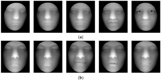 The three-dimensional face data used in this study were obtained from the FRGC v2.0 Database [], collected by the University of Notre Dame in the United States, and included 4007 frontal face scan images of 466 individuals. A total of 1–22 scanned images of each person were collected using a three-dimensional scanner in autumn 2003, spring 2004, and autumn 2004. The images included facial expressions, such as expressionless, smiling, laughing, frowning, bulging, surprised, and small changes in attitude. This database is currently one of the most widely used for face recognition.