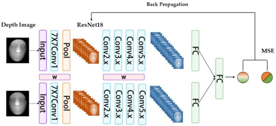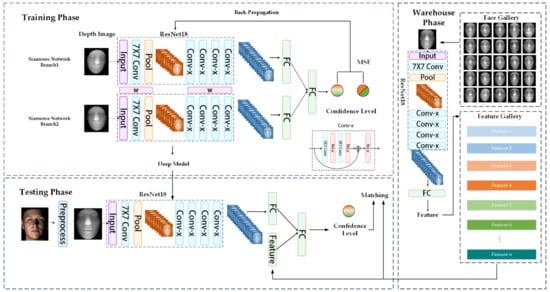 The process of the proposed face recognition algorithm is shown in Figure 3, and it includes three main phases: (1) Training phase: The pre-processed faces are used for transfer learning from the pre-trained ResNet18 weight to build a classification model. Then, the transferred weight is shared to construct a Siamese network that was fine-tuned for face binary classification with paired face samples. (2) Warehousing phase: The collected faces are transformed into a feature space. The features of the faces form a feature gallery for future face matching. (3) Testing phase: The input face is scanned and pre-processed to obtain a depth image. Then, the trained network will perform the forward operation to obtain the network output, which plays a role of confidence level to match faces.