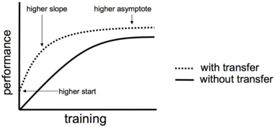 This characteristic of transfer learning can be observed in Figure 4, which shows the changes in network performance during the training process in two scenarios. The higher start point in Figure 4 indicates that the network using transfer learning has better initial performance, and the higher slope reflects the higher accuracy and speed of using transfer learning []. The final higher asymptote indicates that transfer learning has a more competitive final convergence effect.