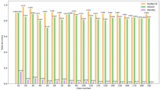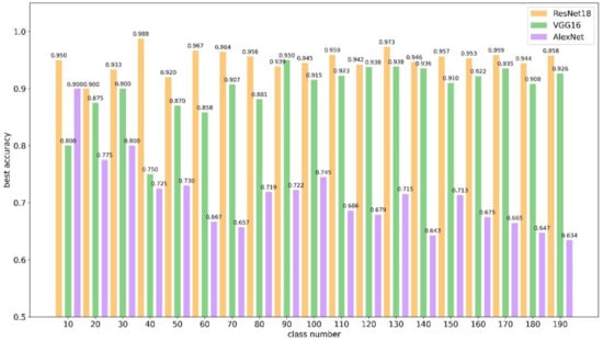 Table 2 shows the changes in classification accuracy of different models for classification with or without transfer learning. It is clear that the classification accuracy was improved when transfer learning was used. The average classification accuracy of ResNet18 after transfer learning was 95.2%, and the average classification accuracy without transfer learning was 89.0%, showing an increase of 6.2%. The average classification accuracy of VGG16 after transfer learning was 90.0%, and the average classification accuracy without transfer learning was 83.4%, showing an increase of 6.6%. The average classification accuracy of AlexNet after transfer learning was 71.0%, while the average classification accuracy without transfer learning was only 3.1%, showing an increase of 67.9%. These results indicate that transfer learning dramatically improved the accuracy of AlexNet’s face classification, and it also had a significant effect on the improvement of the classification accuracy of the other two networks. When there were fewer categories, the amount of test data was lower due to the small sample size. Therefore, when validation was performed, the validation accuracy was not sufficient to reflect the full performance of the network.