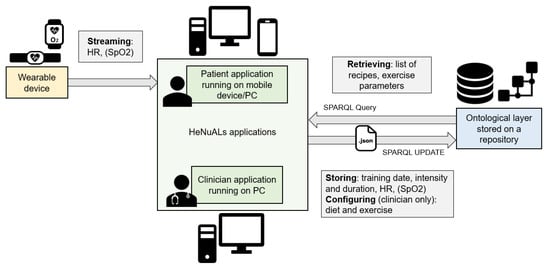 To send data from HeNuALs applications to the ontological layer, middleware was developed by means of Java scripts [58]. By using a SPARQL UPDATE query pattern, selected data (provided to the middleware in the form of a JSON file) from the applications (e.g., training data produced by the patient application) are sent to the ontology to complete the modeling of an individual representing the exercise session. Using SPARQL, HeNuALs applications (described in Section 3.4 and Section 3.5) can retrieve information to be shown to the end users and the clinicians. Instead, the updating and modification of the information contained in the ontology (especially those pertaining to the health condition) is a prerogative of the clinical personnel.