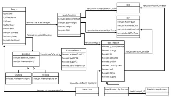 HeNuALs relies on an ontological layer to formalize relevant information related to patients, foods, and exercise. The ontological layer is developed with World Wide Web Consortium-endorsed languages (e.g., Resource Description Framework (RDF) [35] and Ontology Web Language (OWL)) [36]. Following the most common practices for collaborative ontology development in the healthcare domain [37], the HeNuALs ontological layer foresees the reuse of existing models or knowledge sources (as further illustrated). The result of this development process consists of an ontology encompassing three main modules and a set of rules (developed with the Semantic Web Rule Language (SWRL) [38]), each of which is described in the following subsections. The HeNuALs ontology is stored in a semantic repository (Stardog Knowledge Graph [39]), which can be queried with SPARQL [40]. Figure 2 represents the ontological layer by means of the Unified Modeling Language (UML) and illustrates the classes and their attributes (datatype properties) together with the relationships held among classes (object properties), and Figure 3 reproduces a snapshot of the HeNuALs ontology TBox.