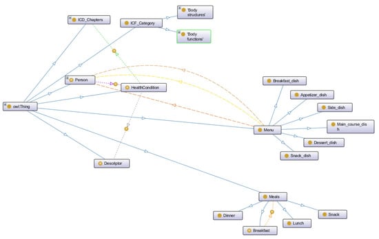 The adoption of ontology-based Decision Support Systems has been widely investigated in many health-related fields, such as Ambient Assisted Living [21,22], continuity of care [23], physical rehabilitation [24], and its extension to the area of supporting the nutrition of different types of patients, and enhancing their physical conditions can potentially help patients in enhancing their quality of life. However, very often, these two sides—nutrition and physical condition enhancement—are treated separately, although in clinical practice, these aspects are complementary and strongly intertwined.