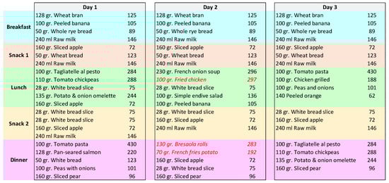 In addition, the ability to infer whether or not a diet plan was suitable for a patient was tested. As presented in Section 3.1, each patient could insert his or her daily diet plan by specifying the dishes he or she wanted to eat. Plans could contain any of the dishes modeled in HeNuALs and therefore could comply to a specific patient’s suggestions or not. Moreover, even a diet plan containing healthy or adequate suggestions may not have respected the caloric intake recommended to the patient by the clinicians. As an example, Figure 4 reports three of James’ plans: