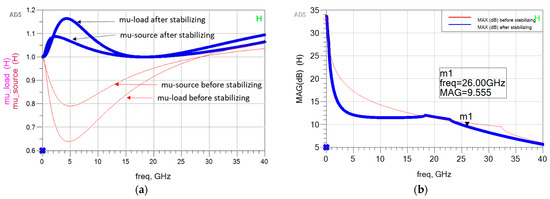 Prior to determining the power gain and saturated power of the transistor cells, it is essential to analyze the small-signal stability of the biased transistors so as to guarantee that no oscillation phenomena will arise, using Rollet’s linearfactors, as well as the geometrically derived () factor. In the first step of DPA design, to make the transistor unconditionally stable, a parallel RC network is located in series with the gate path, which increases the input impedance of the transistor at lower frequencies and provides good flexibility to shape the gain. The parallel capacitance decreases the equivalent impedance of the stability network at higher frequencies. The source and load factors, before and after stabilizers, are depicted in Figure 2a for the main transistor. As can be seen, the source and load criteria are greater than one at all frequencies after stabilizing and any impedance of the Smith Chart is suitable for matching. Figure 2b plots the effect of the stability network on the maximum available gain (MAG). The RC network introduces a dissipative loss, which decreases with frequency. A comparison between MAG without stabilization networks and MAG with an RC network reveals the small-signal gain reduction that occurs at the expense of decreasing the probability of parametric and out-of-band oscillations. The MAG at the main transistor is degraded to around 1.5 dB at 26 GHz under the same bias condition.