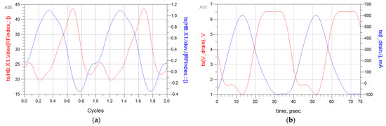 In Figure 3a, the 45 overlap between the half-sinusoidal current and the voltage waveforms degrades the optimum output power and drain efficiency. Moreover, the drain current deviates from the ideal half-sinusoidal shape due to the suboptimal second-harmonic impedance termination and the parasitics of the transistors. Conversely, the approximated square-wave drain-source voltage of the modified Class-J PA, shown in Figure 3b, is increased by the impedance of the nonlinear output capacitor, which is smaller than the external second harmonic loading. Therefore, the phase mismatch between the voltage and current waveforms is reduced, yielding smaller power dissipation. The parameter can be extracted using the optimum load admittance observed in the extrinsic transistor. The imaginary part of the load admittance must be canceled out by the output capacitance’s susceptance.