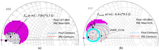 Having obtained the and efficiency contours in Figure 4, the load-pull simulation is conducted for an average of 24 dBm, which is 6 dB lower than the targetof 1 W for DPA. The optimum impedance of the main PA at PBO will be determined by drawing the voltage standing wave ratio circle using Equation (9). Therefore, in order to maintain the power ratio between the main and peaking PAs, the circle of in Figure 4b, centered on the optimum impedance at peak power (, is drawn to determine the . In this way, the optimum impedance at the PBO can be selected on the overlap between the VSWR circle and the efficiency contours ( = 6.4 + j* 9.5 Ω).
