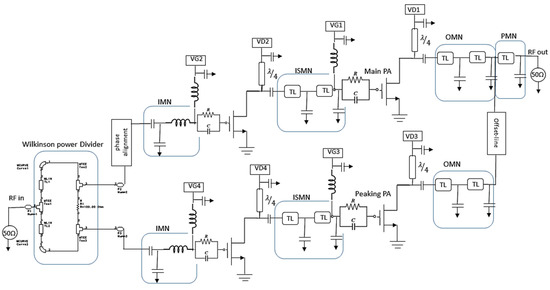 The OMN of the main PA performs the fundamental load impedance inversion by matching 2 to for the peak power, considering that = 1 in Equation (3), and at the same time transferring to for the PBO. It should be noted that the OMN adopts the capacitive second harmonic load termination generated by the profile. Thus, the calculated output capacitor of 0 – j* 2 Ω is injected into the second harmonic load component. Once the design of the OMN of the main PA is completed, the peaking PA, which only handles signal peaks, requires an OMN to transfer the to the optimum impedance at 27 dBm ( 3.5 + j* 3.6) at saturation. In order to prevent power leakage during low-power operation, the peaking PA employs a tuned offset line to provide a phase shift between the devices.