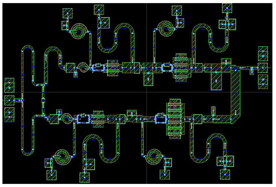 Figure 6 illustrates the final layout of the presented DPA with a die area of 2.3 × 1.4 mm2, including OMN, ISMN and IMN stages. The real-to-real impedance transformation at the output of DPA maximizes the bandwidth and power transformation. The gain equalizer sub-networks are located in the devices gate path to compensate the gain roll-off. The effect of the electromagnetic coupling degrades the PA performance in the compacted MMIC layout at the K-band; therefore, EM simulation is critical to ensure the accuracy of the design rules. In this work, Momentum is used to characterize the spiral inductors and to capture any coupling between transmission lines. In the ADS circuit design environment, the EM models of the matching networks are separately generated for S-parameter models, which will be used in the co-simulation stage.