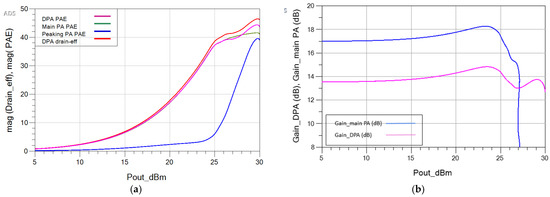 Simulated (a) magnitude of PAE and drain efficiency at the center frequency, (b) power gain of the main PA in comparison with the DPA gain in terms .