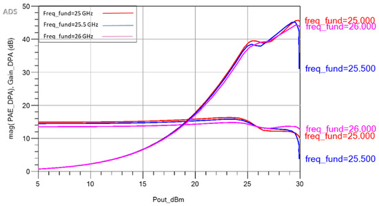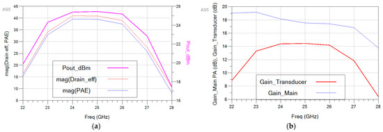 Figure 8 illustrates the similar efficiency and power gain performance of the DPA for frequencies 25, 25.5 and 26 GHz. In the target bandwidth, the variations in the power gain, PAE and drain efficiency at the input power of 10 dBm in Figure 9a,b indicate that the PAE varies between 32% and 40%, reaching a peak at 24.4 GHz, while a large signal gain between 12 dB up to 15 dB was achieved over the operating band frequency of 23–27 GHz. Via proper bias adjustment, an acceptable compromise between efficiency and gain flatness can be obtained over the entire bandwidth, which verifies the accuracy of the proposed design methodology in mm-waves. The output current amplitudes of the main and peaking PAs are shown in Figure 10. The peaking PA at lower power levels consumes low power; however, once it turns ON, its current increases when the impedance reduces from a very high value in the Doherty region. At this point, it provides higher current than the main PA at the maximum power. The small signal gain as well as the return loss of DPA are depicted in Figure 10b. The DPA features an average small-signal gain of about 15 dB, as well as input and output reflection coefficients of less than 5 dB and 8 dB, respectively.