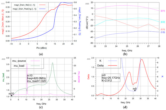 (a) The behavior of the output current of the main and peaking PAs, and (b) S-parameters of the DPA. (c) The source and load μ factors of the DPA. (d) Rollet’s linear