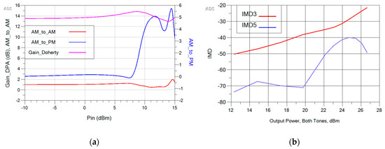 Finally, by increasing the input power level, the nonlinear characteristic of the AM/AM and AM/PM distortion of the DPA are examined, as shown in Figure 11a. It can be noticed that the output amplitude is distorted at the load modulation regime, where odd components are present. The AM/PM effect caused by the device’s nonlinearity contributes to the IMD products and increases the phase distortion on the output signal. The predistortion linearizer can mitigate these distortions. Figure 11b simulates MD3 and IMD5 under the two excitations centered at a frequency of 26 GHz. The designed DPA is tested with a 10 MHz deviation of the two-tone signal. Figure 11b shows the simulated third-order intermodulation distortion (IMD3) and the fifth-order intermodulation distortion (IMD5) products derived from the device’s nonlinearity. The Class-C bias condition of the peaking PA affects the IMD3 and IMD5 of the DPA in the high-power region. Up to the 27 dBm output power range, the IMD3 and IMD5 are less than −20 dBc, which reflects reasonable linearity at two differently biased PAs with tone spacing.