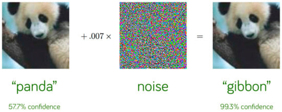 An adversarial example is an input sample in which it has been added an imperceptible noise so that it can be misclassified. A characteristic example is presented in Figure 1 where an attack has been applied to a deep learning model [9] leading to a wrong classification with high confidence. Szegedy et al. [8] were the first authors who investigated adversarial examples and they concluded that the success of this attack is due to the lack of generalization in the low probability space of data. However, some later works [9,17] have shown that even linear models are vulnerable too and an increase to the model’s capacity improves its robustness to these attacks. According to Hu et al. [48], it is important to study why adversarial examples exist and to better understand deep learning models in order to create more robust models. Attacks can be divided into three categories depending on the knowledge of adversaries. The first category is the white-box attack in which adversaries know everything about the model such as architecture and parameters. The second category is named grey-box attack and the adversaries know the structure of the model but not the parameters. Lastly, in the third category, adversaries know nothing about the model’s structure and parameters. In addition to this, there are targeted and untargeted attacks. In the former, attackers want to misclassify the input sample in a specific class, while in the latter they just want the sample data to be misclassified. There are numerous adversarial attacks and defenses [49] but none of these defenses is a panacea for all types of attacks.